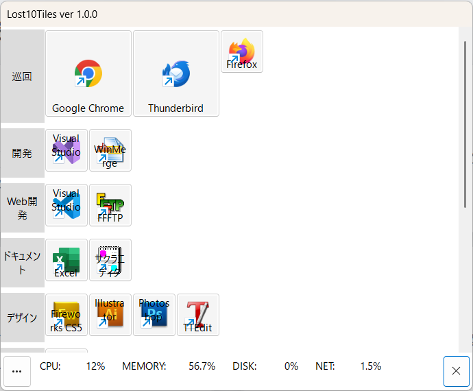 - アプリの EXE / LNK をグリッドへドロップして登録。